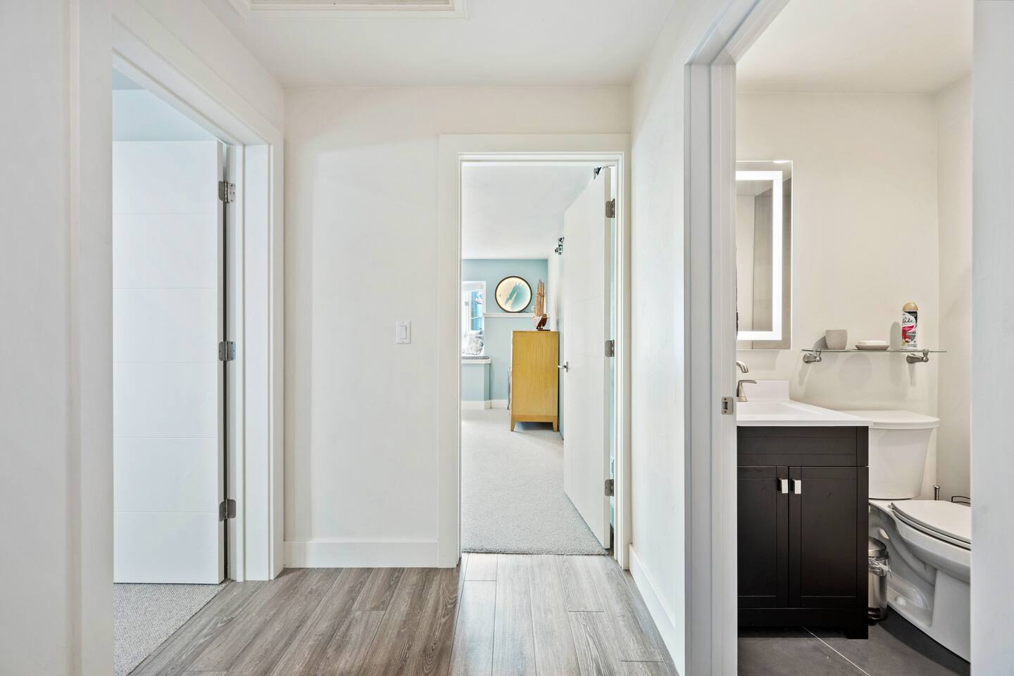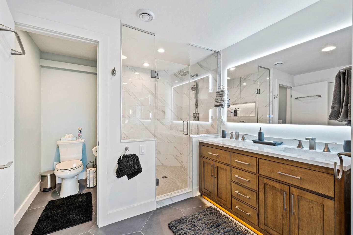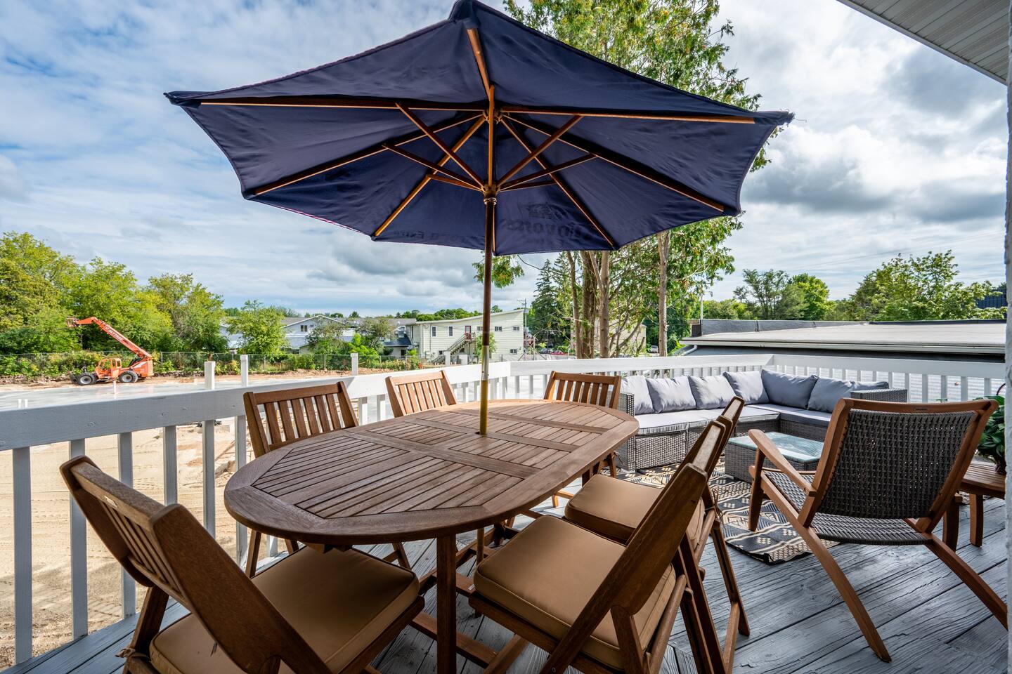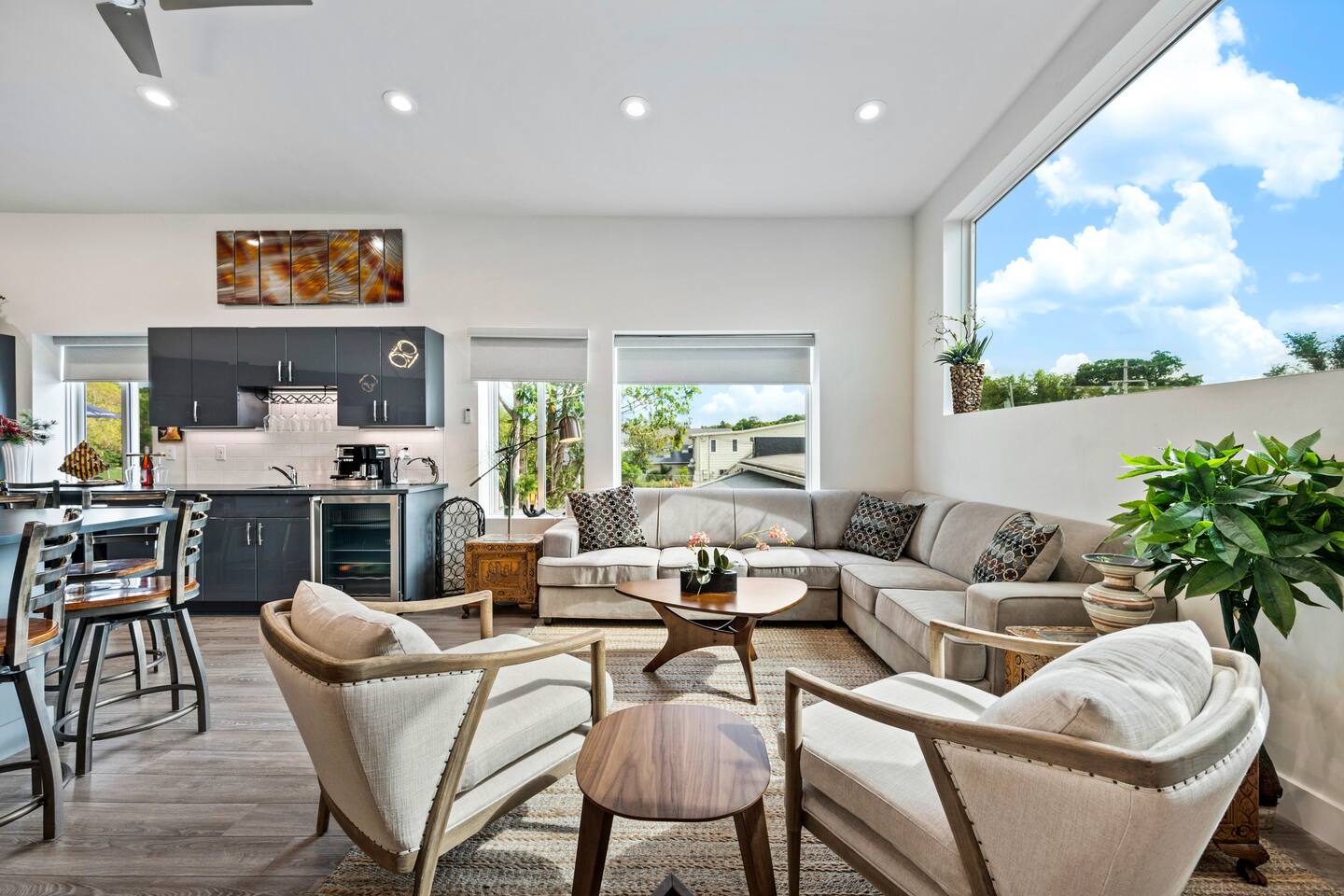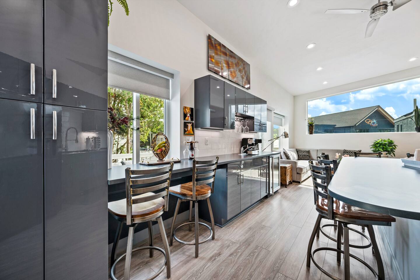 The Loft is designed for relaxed get-togethers, with everything on one open, airy level. Layout & highlights – Two king bedrooms, each just steps from a full bathroom – Large living room with two queen sleeper sofas and an 86" Smart TV – Fully equipped kitchen with island seating for up to 8 – Private deck with dining table, lounge seating, and Weber grill – High-speed Wi-Fi and in-unit washer/dryer
